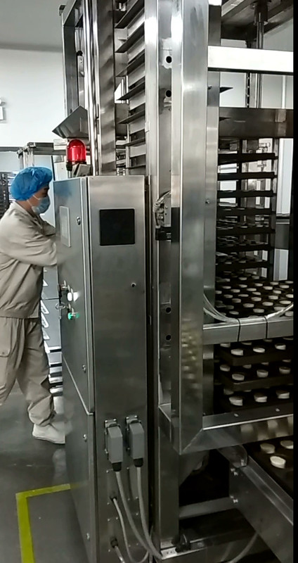 Após o cozimento, o desmoldador da sução/desmoldador/aleta da agulha – sobre o desmoldador tomará os produtos para fora dos moldes. Os produtos cozidos são refrigerados pelo refrigerador espiral e as bandejas vazias retornam através do túnel refrigerando da bandeja à massa que posiciona e que filtra a máquina. E participe no ciclo seguinte.
